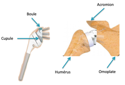 Une prothèse d’épaule imite l’anatomie normale de l’épaule en reproduisant ses structures à l’aide d’une cupule fixée à l’omoplate qui imite la glène et d’une boule en métal qui imite la tête de l’humérus. Dans une prothèse inversée d’épaule, c’est la boule qui est fixée à l’omoplate et la cupule à l’humérus.