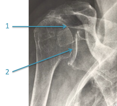 1/Diminution de l’espace entre l’acromion et la tête de l’humérus marquant la rupture de coiffe – 2/Arthrose
